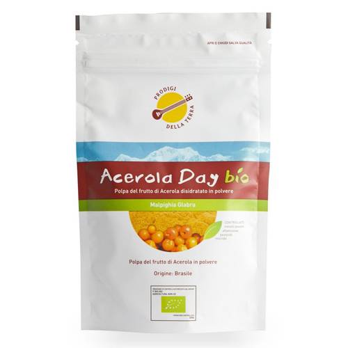Acerola Day Acerola polpa del frutto disidratato e polverizzato. I frutti rossi, simili a ciliegie, hanno un gusto acidulo, dalla buccia sottile, e sono fonte naturale di vitamina C. Auta a sostenere l’equilibrio immunitario, malattie da raffreddamento, sindromi influenzali, fragilità capillare, coadiuvante per l’assorbimento di ferro nelle anemie. Confezionato in buste stand up richiudibili ermeticamente, scelte per preservare la qualità mantenendo il prodotto fresco fino ad esaurimento della confezione e proteggendo dalla luce le preziose molecole nutrizionali. Un cucchiaino di Acerola Day apporta circa 0,3 grammi di vitamina C, coprendo così un ottimale fabbisogno giornaliero consigliato.