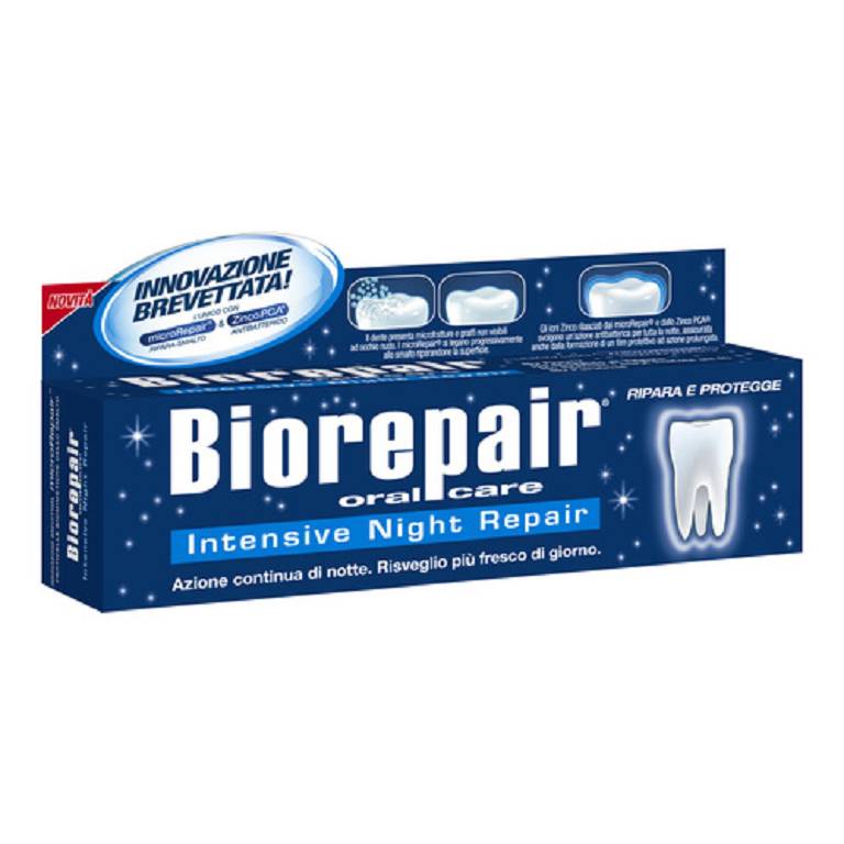 Biorepair oralcare Intensive Night Repair Dentifricio a base di microRepair ripara la superficie dello smalto durante la notte formando una barriera protettiva contro acidi e batteri e remineralizzando e riparando lo smalto dei denti.