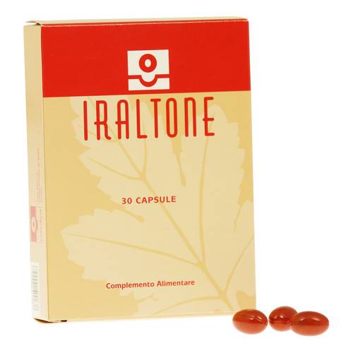 IRALTONE Integratore alimentare a base di Metionina, Selenio, Zinco, Ferro, Rame, Vitamina E, Acido alfa lipoico, Glutatione, Betacarotene, Olio di semi di zucca, Cartilagine di squalo, Serenoa serrulata ed estratto di Soia, utile in presenza di carenze alimentari o di aumentati fabbisogni organici dei nutrienti in esso contenuti.