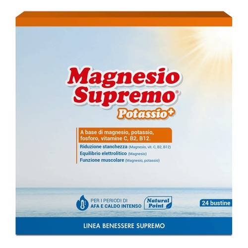 Integratore alimentare a base di magnesio che contribuisce alla riduzione di stanchezza e affaticamento. Utile in caso di caldo, afa e attività fisica. Contiene la miscela di Magnesio supremo in associazione a potassio, fosforo e vitamine da fermentazione (C, B2, B12).