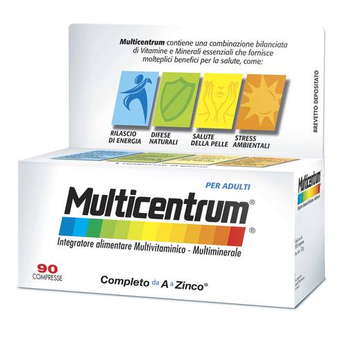 PER ADULTI Multicentrum Integratore alimentare multivitaminico e multiminerale con luteina ed edulcoranti. La formula di Multicentrum contiene specifici quantitativi di vitamine e minerali che forniscono molteplici benefici quotidiani come: rilascio di energia, difese naturali, salute della pelle, protezione dagli stress ambientali. Senza zuccheri. Senza glutine.
