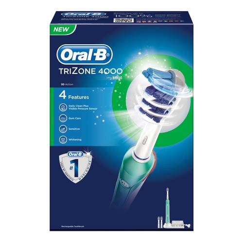 Contenuto della confezione: 1 manico per spazzolino elettrico ricaricabile, 3 testine TriZone, 1 base di ricarica con vano per le testine.