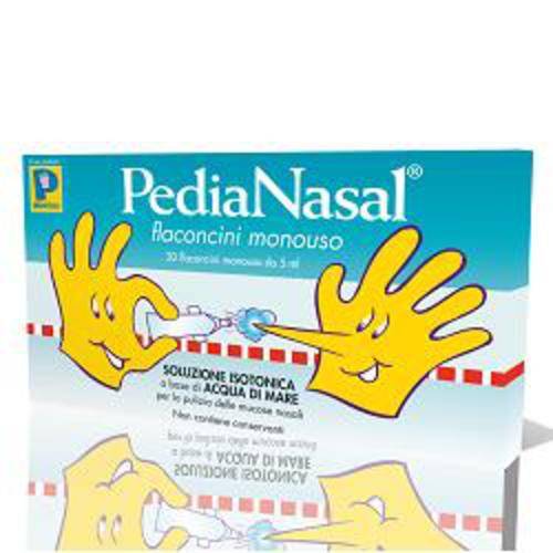 Soluzione isotonica per l’irrigazione nasale a base di Acqua di Mare. PediaNasal flaconcini è una soluzione isotonica a base di acqua di mare. Particolarmente indicato per la pulizia delle mucose nasali dei bambini, in caso di nasino chiuso o mucose secche. PediaNasal® aiuta il drenaggio delle secrezioni nasali consentendo di avere una respirazione corretta, anche nei casi di raffreddore, riniti e sinusiti; agisce pulendo le cavità nasali in modo fisiologico rispettando il normale equilibrio delle mucose; facilita la poppata garantendo una migliore respirazione; facilita l’addormentarsi dei neonati e dei bambini grazie all’eliminazione del muco che spesso ostruisce il nasino.
