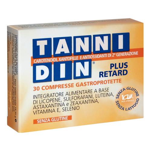 TANNI DIN PLUS RETARD Integratore alimentare formulato con carotenoidi e xantofille. Formulazione retard: i principi attivi vengono resi disponibili gradualmente consentendo un migliore assorbimento, ricoprono un arco di tempo più ampio, e riducono una eventuale potenziale irritazione gastrica originata dai componenti. Non comporta aumento ponderale. L'elevata tollerabilità consente l'utilizzo a soggetti di tutte le età. Senza glutine. Senza lattosio.