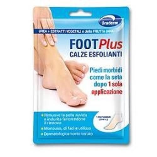 Uraderm Foot Plus Calze esfolianti contenenti un gel a base di urea, estratti vegetali e acido della frutta (AHA). Ideali per rimuovere callosità, altre forme di ispessimento della pelle e levigare i talloni screpolati. Rimuove la pelle ruvida e indurita favorendone il rinnovo.