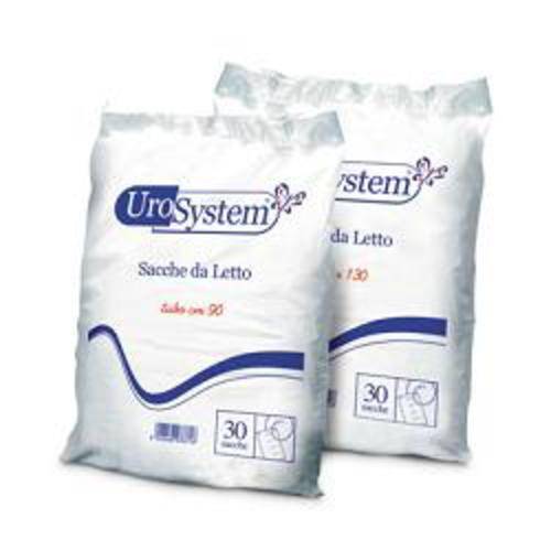 UroSystem Sacche da letto Dispositivi Medici conformi al Decreto Legislativo n. 46 del 24-02-1997. Sacche da letto senza valvola di scarico 30 sacche con tubo da 90 cm e tubo da 130 cm. Con scala graduata e spazio per i dati del paziente. Con asole per l’aggancio al letto e doppia saldatura laterale.